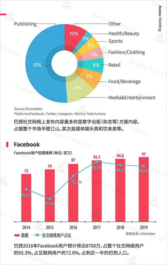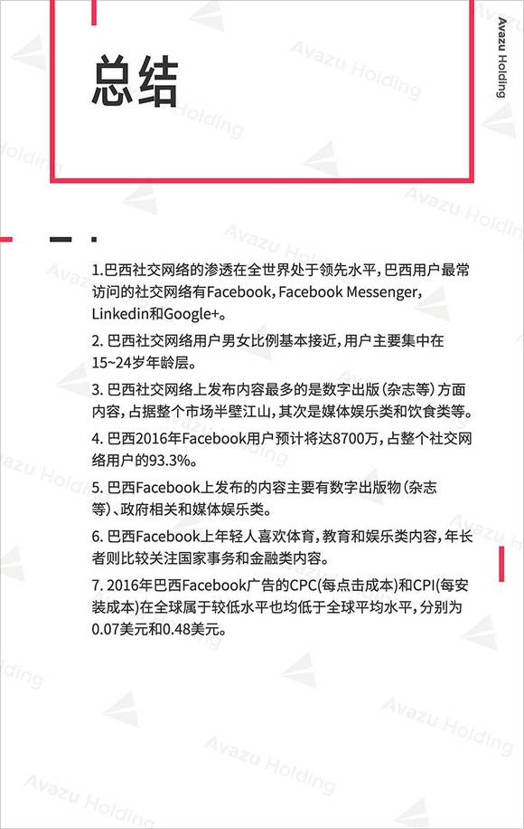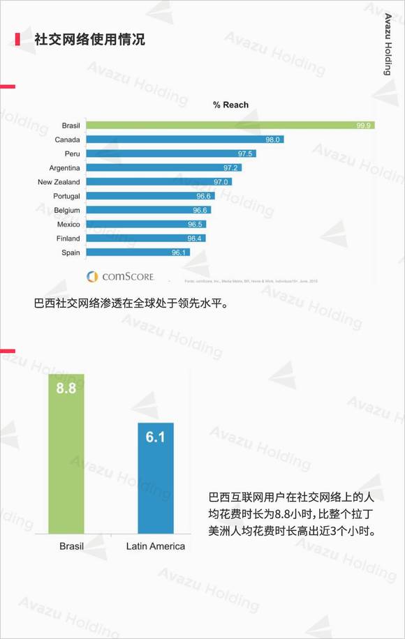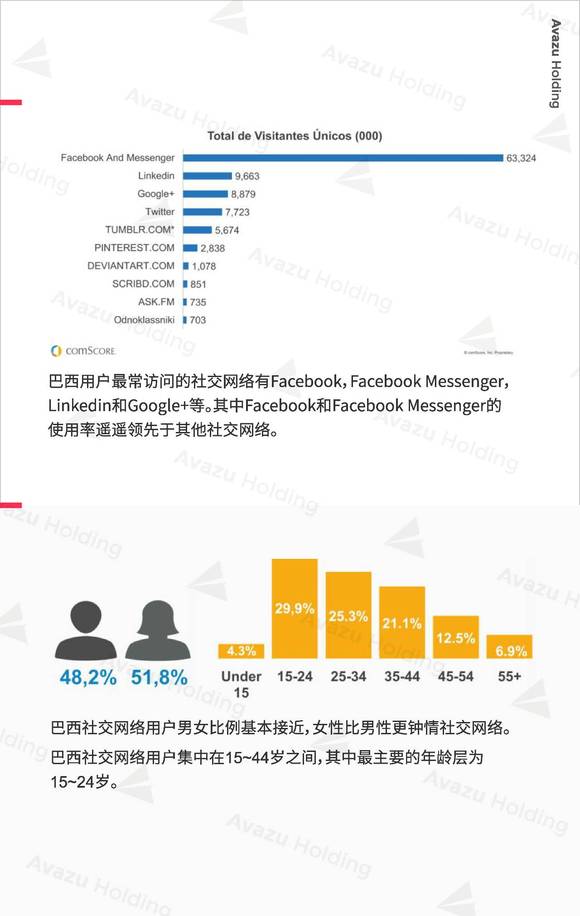 巴西社交网络渗透在全世界处于领先水平,巴西用户最常访问的社交网络有Facebook,Facebook Messenger,Linkedin和Google+。
