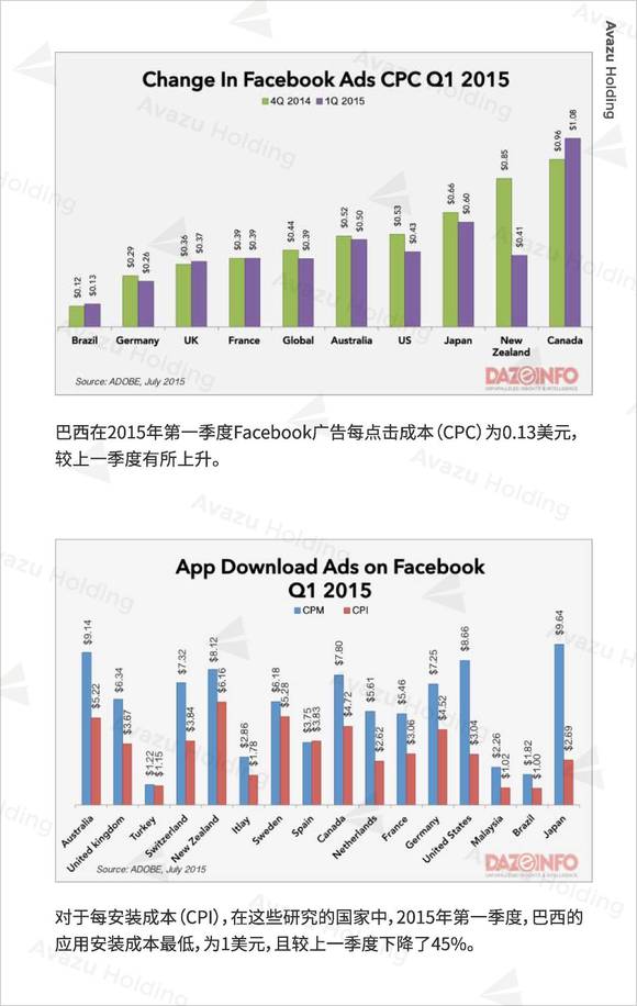 2016年巴西Facebook广告的CPC(每点击成本)和CPI(每安装成本)在全球属于较低水平也均低于全球平均水平,分别为0.07美元和0.48美元。