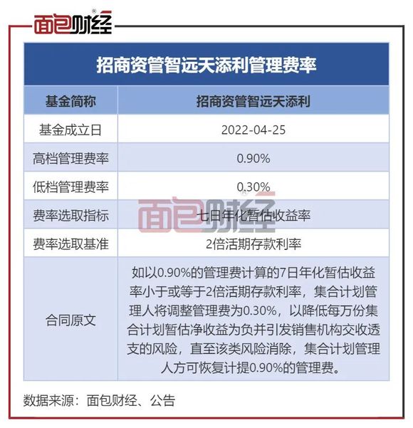 翻阅基金合同发现,招商资管智远天添利采取两档管理费率,低档管理费率为0.3%,高档管理费率为0.9%,其设置的分档标准为2倍活期存款利率。简单来说,该产品七日年化暂估收益率若超过2倍活期存款利率(约0.7%),则收取0.9%管理费;否则收取0.3%。