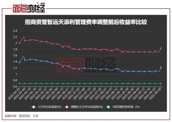 即便业绩排名靠后,招商资管智远天添利因七日年化收益率均维持在2倍活期存款利率(约0.7%)以上,2022年上半年仍然按照浮动费率的高档,即0.9%向投资者收取管理费。