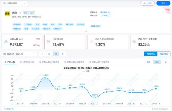 从行业渗透率来说,闲鱼还是“老大哥”。易观千帆数据显示,2021年12月,闲鱼在二手电商领域活跃人数行业渗透率占80%左右,拥有相对的行业优势,牢牢占据行业榜首,而仅次于闲鱼的转转,市场渗透率仅为16%左右。“从2021年整体的数据显示,闲鱼、转转月度活跃用户数整体趋势均为不稳定状态。”易观千帆指出。