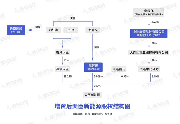 2017年6月,天臣新能源有限公司(下称天臣新能源)成立,注册资本10亿元,其中深圳天臣出资6.8亿元,黑芝麻出资3亿元,大连智云出资0.2亿元,对应持股比例分别为68%、30%和2%。