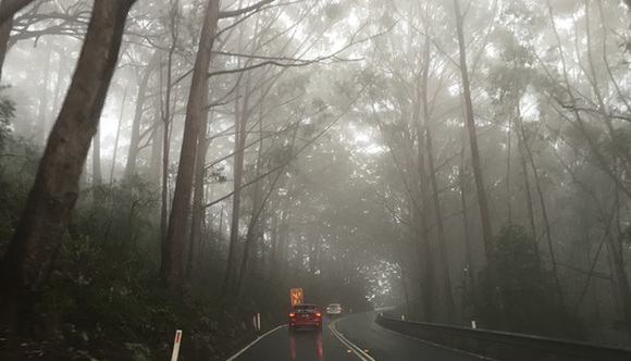 从Wattamolla海滩开始,路线从沿海行驶转向内陆,进入丛林。地处亚热带湿润气候的悉尼阴晴不定。在征服这段蜿蜒曲折的山路时又恰逢狂风暴雨,林间的雾气在互相交错的参天古树中萦绕,新福克斯的自适应雨刷也从3秒/次的频率提升为1秒/次。在无法看清5米以外前车尾灯的条件下,你唯一能做的就是打开雾灯、注意仪表板上的预碰撞系统警告。除此以外,就是祈祷不要遇到《寂静岭》里的怪物。