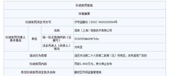 处罚书显示,当事人为提高其产品销量,自行设计、制作“欧华妍海藻精粹呼吸泡泡面膜”广告,并于2021年10月1日开始在昆岸(上海)信息技术有限公司静安分公司兴业太古汇店铺及小程序上发布了该广告。
