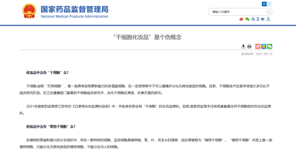 同年9月,国家药监局更是发布了科普文《“干细胞化妆品”是个伪概念》,对“干细胞化妆品”进行详细解读。文中指出:干细胞是一类具有自我更新能力的多潜能细胞,在一定诱导条件下可以增殖并分化为其他类型的细胞。目前,干细胞技术在医学领域大多仍处于临床研究阶段。