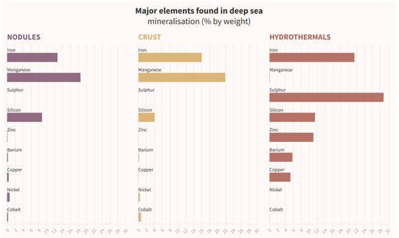在深海,富含矿产的物质有三种:第一种是多金属结核,富含锰、铁、钴、镍和铜;第二种是多金属结壳,富含锰、铁、钴和铂;第三种是多金属硫化物,富含铜和锌,偶有金、银。多金属结核和多金属结壳分布较广,但多金属硫化物则较为罕见。