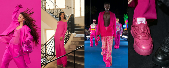 上图:从Zendaya、Gigi Hadid、Kim Kardashian、Anne Hathaway、张艺兴、郑秀文等明星造型,到Dior 2023春季男装、Versace 2022秋冬、Valentino 2022秋冬等奢侈品秀场,以及Jacquemus、Ami、Raf Simons、Moschimo的单品,粉色随处可见。