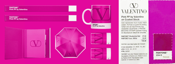 Pink PP 由 67%的玫瑰红(Rhodamine Red)加 33%的透光白(Trans. White)混合而成,成为 Valentino 品牌的专属色。