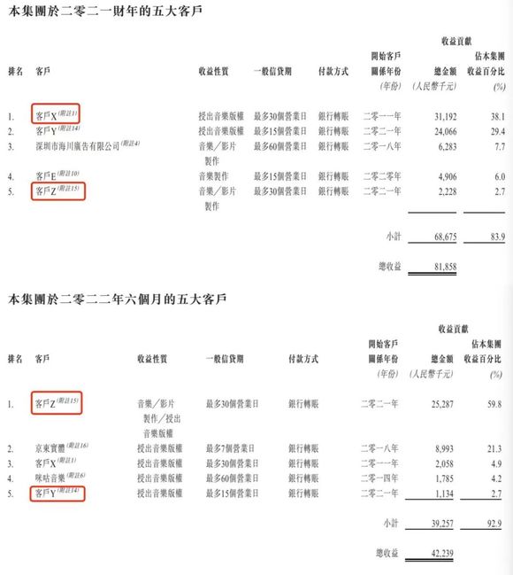 但硬糖君发现,这些客户的金额也在逐年降低。客户X在2020年从4804万的收入贡献,到2022年上半年仅有205万。根据招股书对客户X的描述,纽交所上市集团,经营线上音乐平台,大概率就是TME。