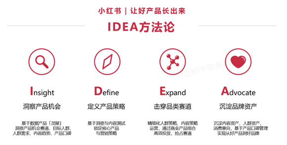 小红书IDEA方法论的核心为四个环节:Insight洞察产品机会、Define定义产品策略、Expand击穿品类赛道、Advocate沉淀品牌资产。这四个环节形成了一个营销闭环,每完成一个闭环就会进入下一个循环,不断迭代。