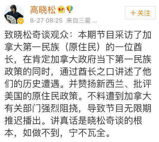 8月27日,高晓松发表微博称,自己的节目因遭到“加拿大有关部门强烈阻挠,导致节目无限期推迟播出”。他还强调:“讲真话是晓松奇谈的根本,如做不到,宁不瓦全。”
