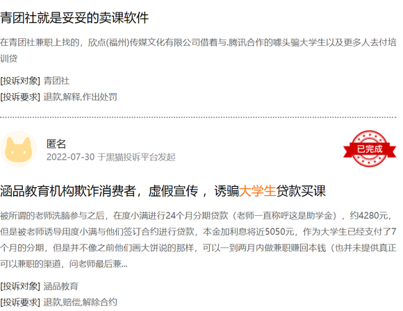 锌刻度发现,像小风一类的大学生在找兼职时被诱导买课、分期付学费的事件屡见不鲜。在黑猫投诉上,搜索“大学生兼职”就有2710条结果,其下不乏为“青团社就是妥妥的买课软件”“骗取大学生兼职、诱导教育分期”“虚假兼职、诱导大学生借贷”等内容;而在知乎、小红书等平台上,也有大量关于机构退费难、借兼职诱导分期等吐嘈性内容。