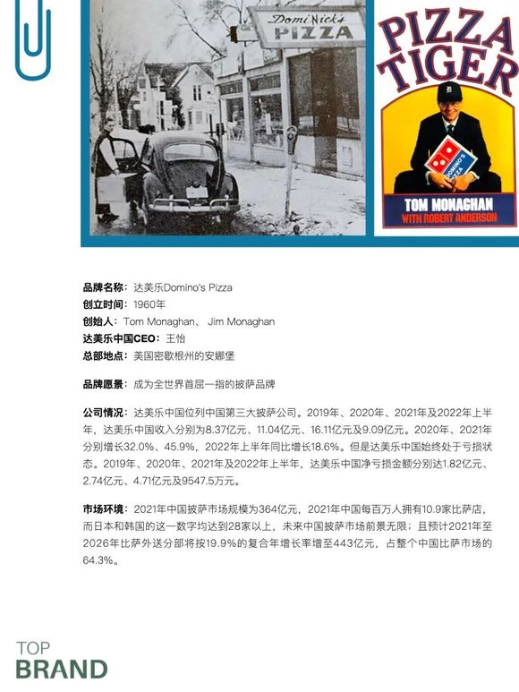 磕磕碰碰地念完了中学的汤姆,在进入大学一个月后就因为经济问题退学参军了。1960年,哥哥吉姆给处于迷茫的弟弟带来了希望。当时吉姆是一个邮递员,在送信的过程中,他无意中发现一家比萨饼店濒临倒闭。于是,兄弟俩借贷了500美金买下了这家店,开始了自己的创业生涯。