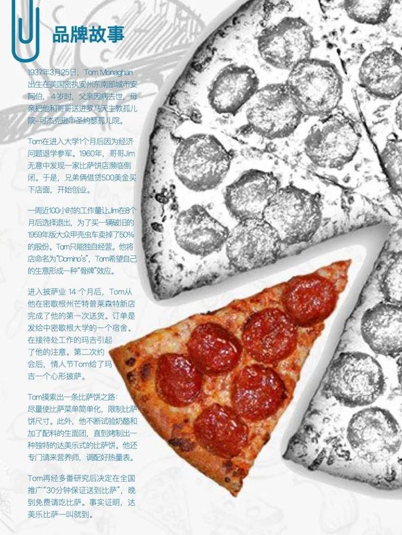 前期,一周近100小时的工作量让哥哥选择了退出,汤姆只能独自经营。他将店铺命名为“Domino‘s”,因为Domino翻译过来就是“骨牌”的意思,汤姆希望自己的生意形成一种骨牌效应。