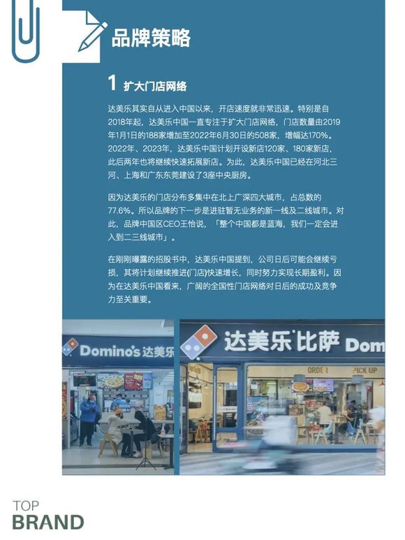 ·渠道策略:线下渠道:截至2022年6月19日,达美乐在全球90多个市场拥有超过19200家门店,而截止目前达美乐中国在内地的 12 个城市 ( 北京、上海、深圳、广州、天津、杭州、南京、苏州、无锡、宁波、佛山、东莞 ) 直营 547 家门店;