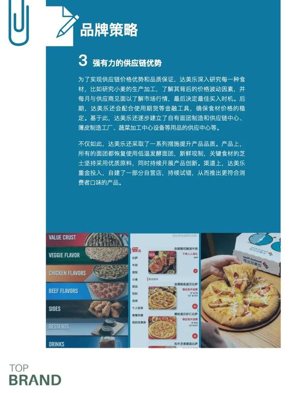 为了实现供应链价格优势和品质保证,达美乐深入研究每一种食材,比如研究小麦的生产加工,了解其背后的价格波动因素,并每月与供应商见面以了解市场行情,最后决定最佳买入时机。后期,达美乐还会配合使用期货等金融工具,确保食材价格的稳定。基于此,达美乐还逐步建立了自有面团制造和供应链中心、薄皮制造工厂、蔬菜加工中心设备等用品的供应中心等等。