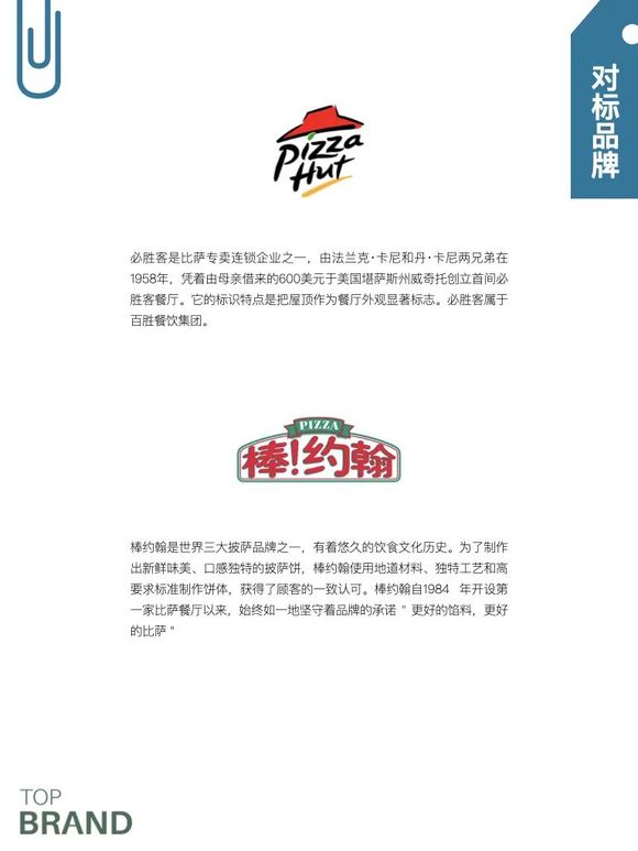 棒约翰:棒约翰是世界三大披萨品牌之一,有着悠久的饮食文化历史。为了制作出新鲜味美、口感独特的披萨饼,棒约翰使用地道材料、独特工艺和高要求标准制作饼体,获得了顾客的一致认可。棒约翰自1984 年开设第一家比萨餐厅以来,始终如一地坚守着品牌的承诺“更好的馅料,更好的比萨” 。