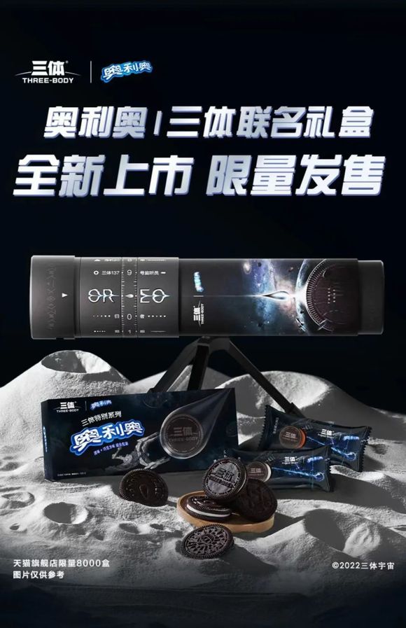 10月17日,奥利奥在天猫小黑盒首发《三体》联名礼盒。特价199元的预售礼盒里只有一份奥利奥饼干,“买椟还珠”的意味稍微有些重,不过3个晚上的直播卖出去了超过1000个。同时,另一组到手价格55元的联名饼干组合礼包也卖出去了近4000份。一直被视作硬核科幻代表的《三体》,与快消品的联名也能产生相当规模的销量,这或多或少能从商业角度证明《三体》早已跨出了小众科幻圈,正走在拥抱大众的路上。