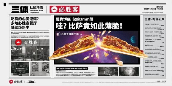 必胜客旗下的双层薄脆披萨连续3年的营销路线都是“科技范儿”,“用科技的方式去诠释比萨的薄脆”。第4年,必胜客终于遇到了《三体》。尽管联名产品和《三体》真的没有太大关系,但冲着印刷了大量经典台词的宣传图,你能说它们之间真没一点关系?