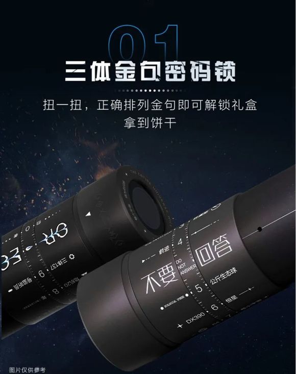 比如奥利奥与《三体》联名推出的礼盒,包括“炫目深渊镜”“朝酷投影”和“三体金句密码锁”,看得出来在设计方面是颇费心思。和《三体》有最直接关联是“金句密码”这一项,而将《三体》各个关键词印在饼干上进行销售,成为了这次联动商品销量提升的直接手段。