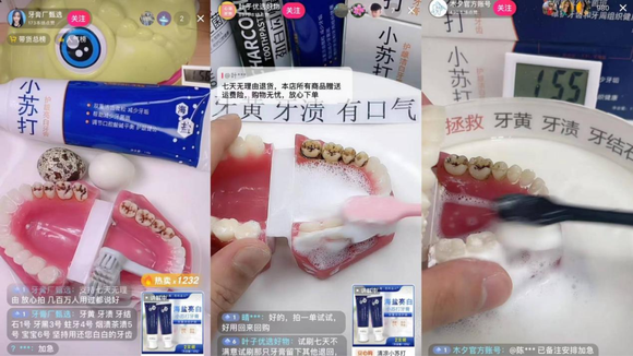 而其他直播账号,则通过“牙齿模具”、“刷鹌鹑蛋”、“漱口吐黄水”等多种极具暗示性的短视频内容, 不断向消费者传递牙膏“美白”的功效。
