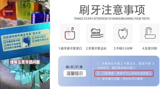 甚至还有商家宣称口腔溃疡一类损坏还可以用牙膏涂抹在创面上,同时宣称为牙龈修复专效牙膏。