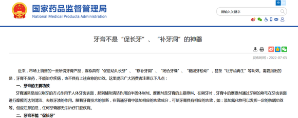 随后国家药监局明确指出,牙膏不是药,不能治疗疾病,也不具有上述宣称的功效。