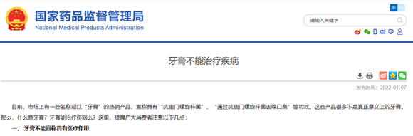 事实上,在1月7日,国家药监局发布《牙膏不能治疗疾病》科普文,特别指出牙膏不能宣称具有医疗作用。