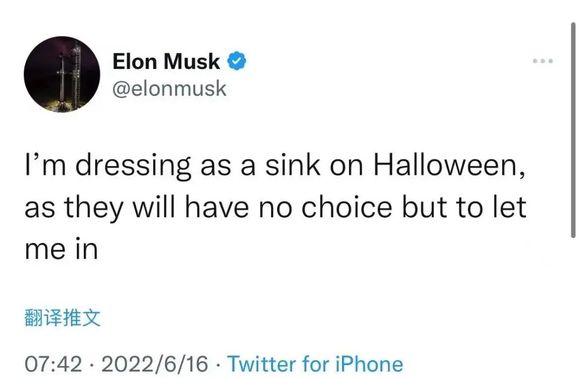 这也呼应了马斯克本人在6月16日发布的推文,他说自己要在万圣节打扮成水槽,这样走到哪里都不会被拦。如今,他真的在万圣节前大摇大摆抱着水槽走进了推特大楼。