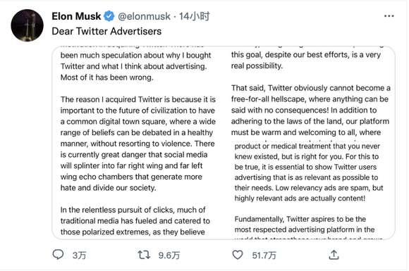 马斯克在推文中表示,他不是为了挣更多的钱才收购推特,而是为了文明的未来。“我买推特是因为它作为一个开放的数字广场,对于未来的文明很重要,所有不同信仰的人都可以在健康的环境中进行讨论,而不是诉诸暴力。”但与此同时,这条推特本身就是发给推特的广告商看的,马斯克也花了两段话陈述推特的广告价值:“推特渴望成为最受尊敬的广告平台,可以为你的个人品牌赋能,也能让你的企业成长。”