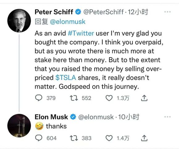 欧洲太平洋资本的CEO兼全球策略师Peter Schiff发推文称,他作为推特狂热用户很高兴马斯克收购了推特,但马斯克无疑付出了一个高于市场价的价格。但某种程度上,马斯克买推特的资金一部分来源于卖掉一些被过高估值的特斯拉股票,因此推特买贵了也问题不大。他还是很看好这桩交易。马斯克本人肯定了这种说法,评论:谢谢。