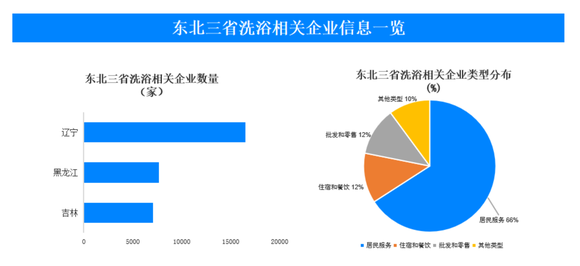 天眼查数据显示,目前东北三省(辽宁省、吉林省、黑龙江省)洗浴相关的企业数量为3.1万余家,占比全国洗浴相关企业总量的6.6%。其中,近8成的企业类型与居民服务、住宿和餐饮业相关。