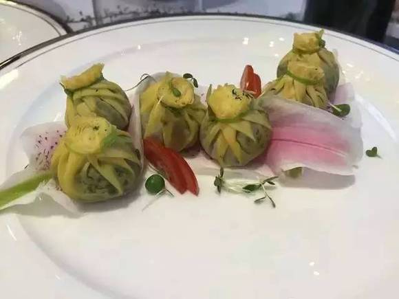 这道点心别具特色,是用面粉加蔬菜汁,手工捏制做成龙井茶叶的样子。配以鸡汤冲泡,鲜美无比。菜品灵感来自有名的点心猫耳朵,制作者的用心可见一斑。