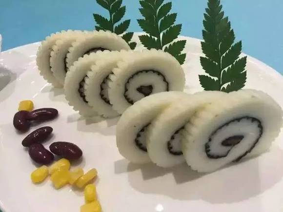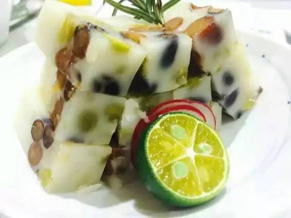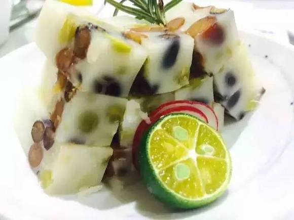 用特殊的木莲粉制作,和传统的木莲豆腐做法类似,加上特殊的模具造型,配以鲜艳的玫瑰花瓣,造型独特,口味清新。