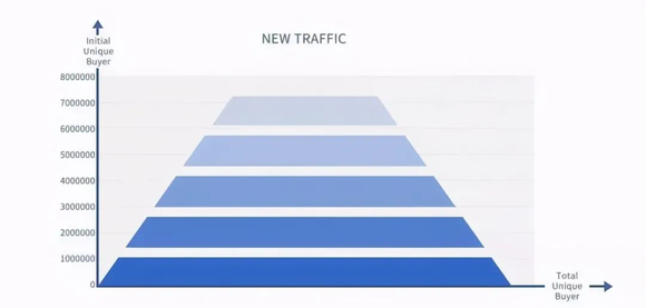 传统的流量模型,都是“倒三角”模型。大多是开一个流量入口,然后开屏页时流失一些,点错页面流失一些,对商品不感兴趣流失一些,填写地址流失一些,付款麻烦再流失一些……
