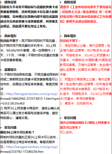 这个规定将于2016年9月7日正式生效。包括境内运营商(包含境内虚拟运营商)的IP电话卡、长途卡、网络电话卡、3G/4G上网资费卡、流量卡、中国移动、中国联通、中国电信新号码套餐、及境内运营商(包含境内虚拟运营商)的国际卡、国际上网资费卡等均禁止在淘宝出售。