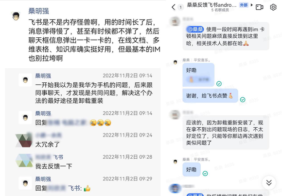 很快,有飞书员工在他朋友圈下面留言会去反馈下。效果也确实不错:对方在1小时内就拉了个飞书群,然后负责人把问题转到技术那边,IM的相关技术人员都在群里,回应也很迅速。不过因为软件被重装了一遍,所以还得等再出状况才能进行具体的问题定位。