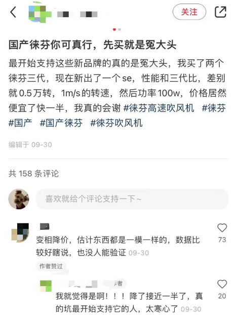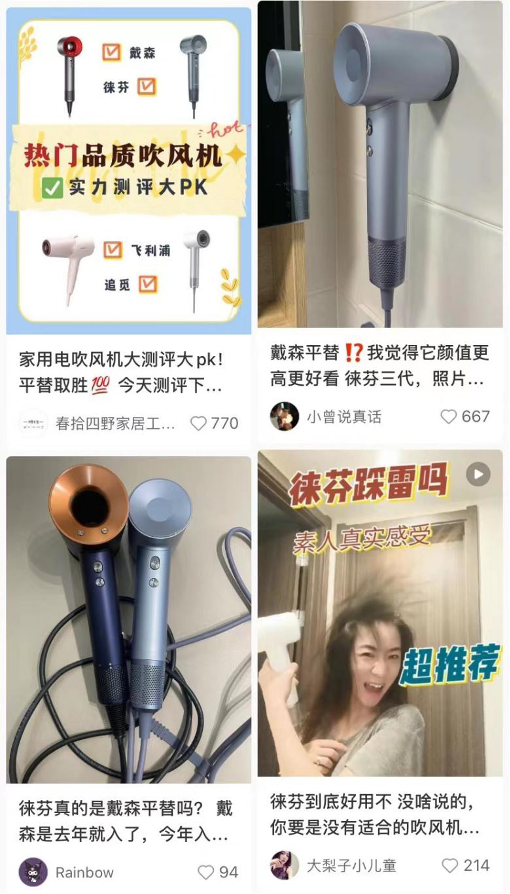 在出圈早期,叶洪新还是承认“戴森平替”这一定位的,抖音、快手、小红书,三大平台上关于徕芬的评测内容千篇一律,充斥着各种“黑科技”“性价比”“超越戴森”等一系列关键词。