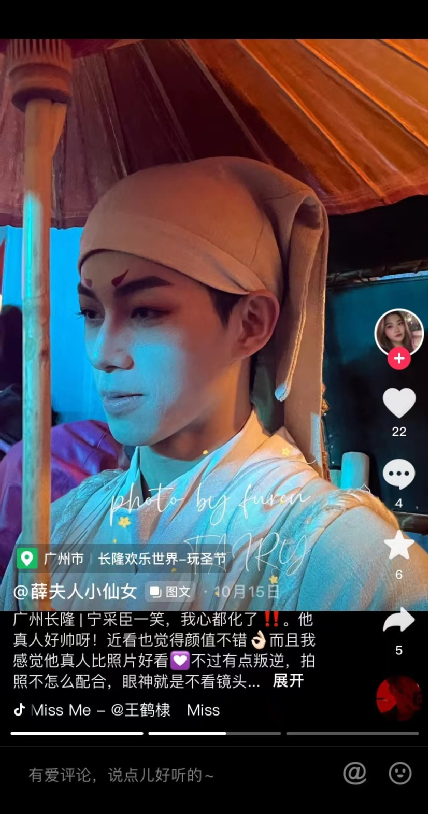 小寒在去游乐园兼职NPC之前,就已经是抖音上的颜值博主,“那时候有大概十几万的粉丝吧。”