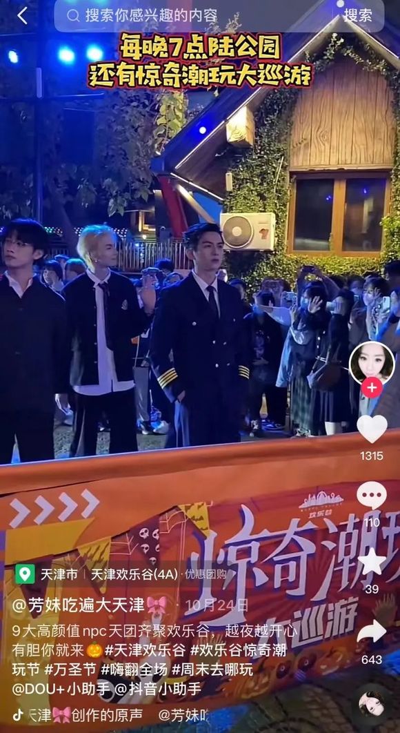 此外,在特定节日时,游乐园也会临时组建NPC男团,比如今年天津欢乐谷在惊奇潮玩节就推出了神颜NPC男团。