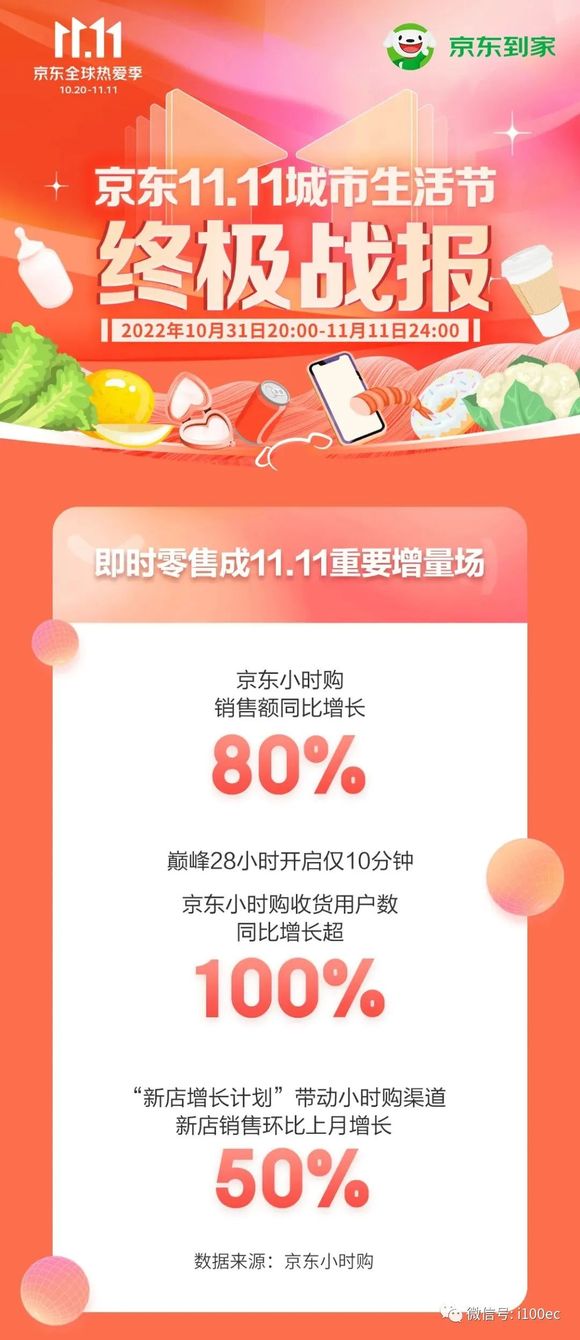 11月12日,京东到家发布11.11终极战报:11.11期间(10月31日晚8点至11月11日24点),京东小时购销售额同比增长80%。11月10日晚8点,“巅峰28小时”开启10分钟,京东小时购收货用户同比去年增长100%。体验到“小时达、最快分钟达”服务的消费者,覆盖全国超过1800个县区市。