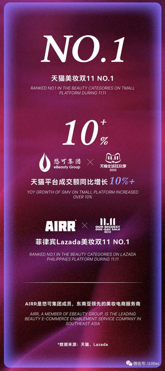 11月12日,悠可发布2022年双11战报。据了解,悠可今年双11共服务80+品牌,位列阿里系中国美妆市场NO.1,连续13年双十一保持两位数正增长。天猫平台仍然是双11主战场。今年双11,悠可在护肤、彩妆、香水香氛等大品类均占据头部位置,高端护肤NO.1,高端彩妆TOP5中占3席,香水香氛Top20中占6席,在17个细分品类中均位居榜单前3。