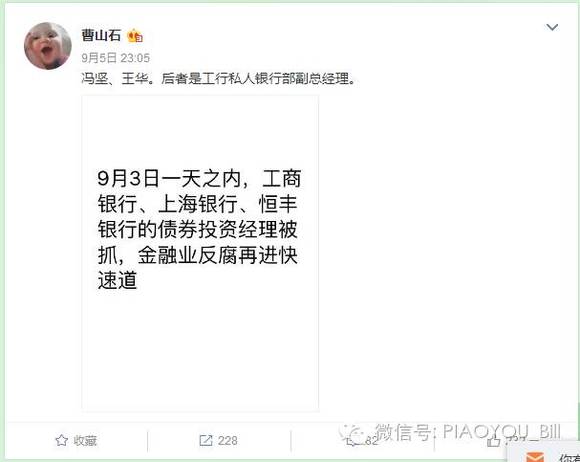 昨日深夜,大V发布一条微博,透露上周六多家银行的债券投资经理被抓,其中提到工商银行、上海银行、恒丰银行的债券投资经理。