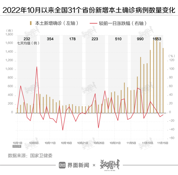 10月以来,全国日增本土感染人数出现增长。国家卫健委数据显示,10月1日-11月15日,全国累计新增本土确诊病例超2万例,累计新增本土无症状感染者超15万例。截至11月15日24时,全国现有确诊病例15345例,尚在医学观察的无症状感染者121499例。