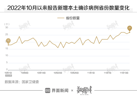 从省份上看,10月以来,本轮疫情已波及全国31个省份。国家卫健委数据显示,截至11月15日,近46天来报告新增本土确诊病例的省份数量由17省增至27省;报告新增本土无症状感染者的省份数量也由26省增至31省。