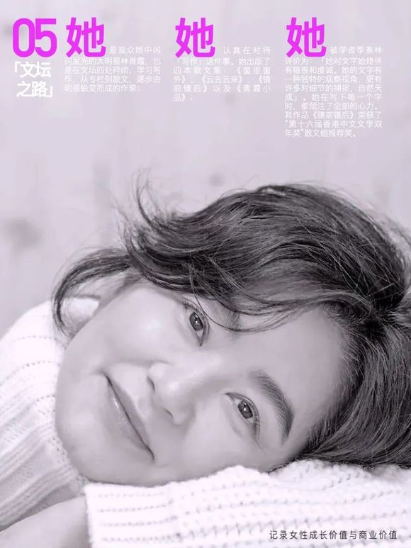 她,非常认真的在对待「写作」这件事。凭借自己的天赋与努力成为了《南方周末》专栏作者,出版了四本散文集:《窗里窗外》、《云去云来》、《镜前镜后》以及《青霞小品》;