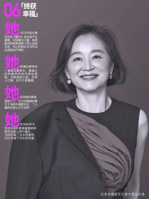 她,1972年因与秦汉合拍《窗外》而对其产生感情,但因秦汉已婚,其原配找到她希望两人停止这段关系,伤心的她在1979年远走美国治疗情伤;