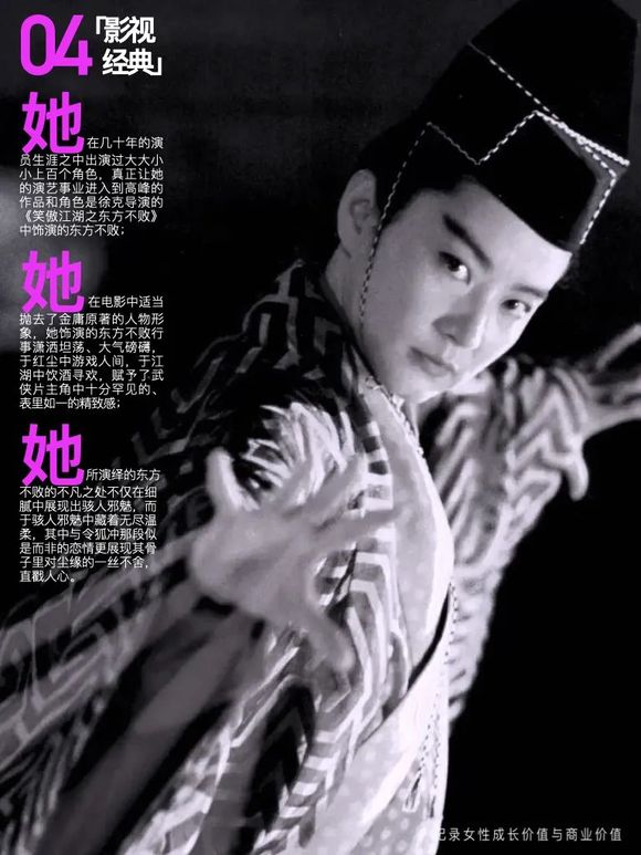 她所演绎的东方不败的不凡之处不仅在细腻中展现出骇人邪魅,而于骇人邪魅中藏着无尽温柔,其中与令狐冲那段似是而非的恋情更展现其骨子里对尘缘的一丝不舍,直戳人心。