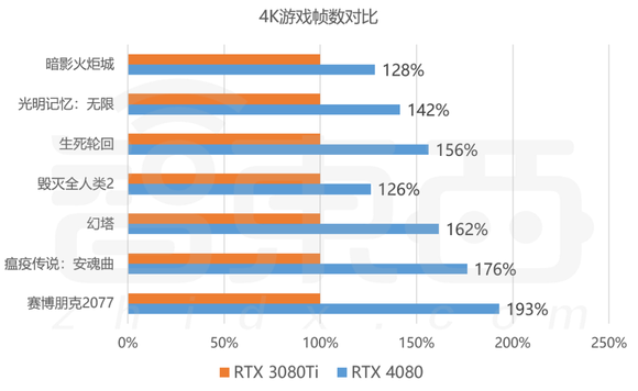 另外,在《幻塔》、《生死轮回》、《光明记忆:无限》等几款单机游戏中,RTX 4080的帧数提升幅度在40%-60%左右。在测试游戏中,《毁灭全人类2》和《暗影火炬城》提升幅度分别为26%和28%。