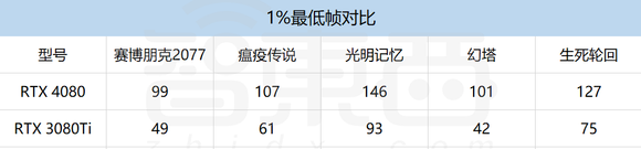 另外值得一提的是,除了游戏平均帧数的提升,在1%最低帧方面,RTX 4080的提升更加明显,比如在《赛博朋克2077》中,1%最低帧从RTX 3080Ti的48帧直接提升到了99帧,翻了一倍还多。